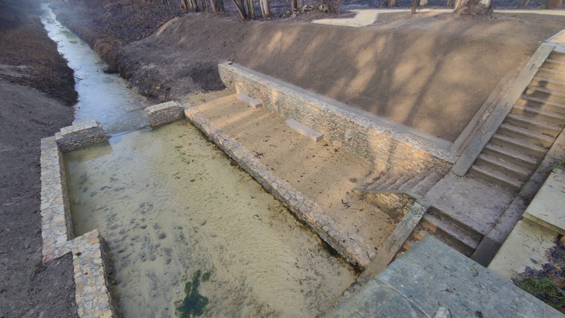 Prace wykonał Gminny Zakład Komunalny ze Zbrosławic oraz Agal Sp. z.o.o. z Rybnika. I etap inwestycji kosztował ponad 1,2 mln zł, z czego 822 tys. zł udało się pozyskać gminie Zbrosławice z województwa śląskiego. Teraz urząd gminy stara się pozyskać fundusze na dalszą część inwestycji. II etap prac zakłada budowę drewnianej ścieżki dydaktycznej wraz z pomostami, mostkiem nad Dramą, wiatami, oświetleniem oraz małą architekturą.